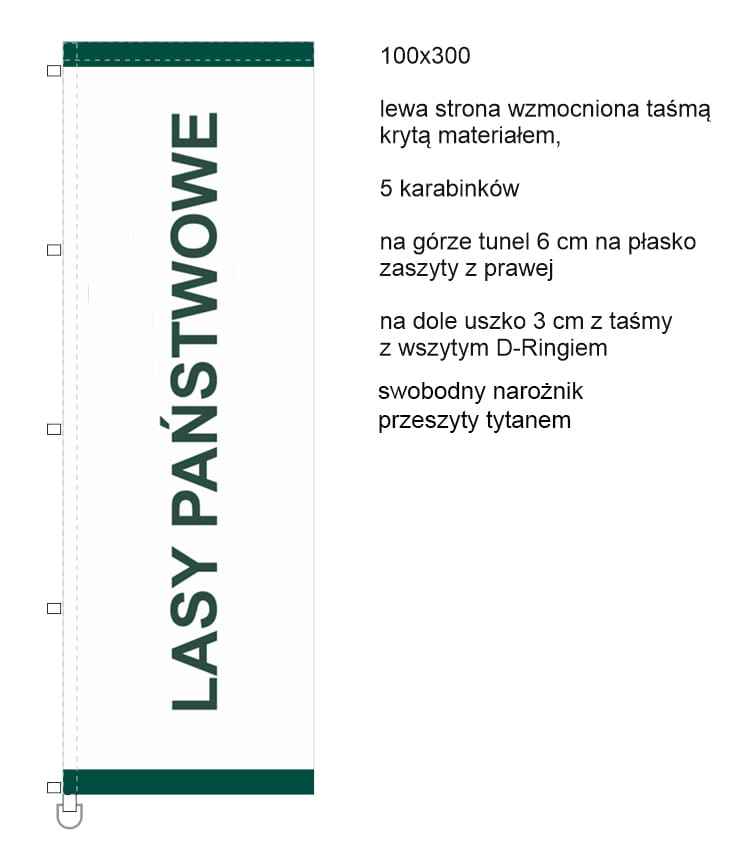 - Lewy bok wzmocniony taśmą "Gurth" owiniętą materiałem flagi, na wzmocnionym boku wszyte uszka, w uszka wpięte 5 wyczepnych karabinków PCV. Na dole flagi uszko z wszytym D-Ringiem PVC do zaczepienia obciążnika flagi.