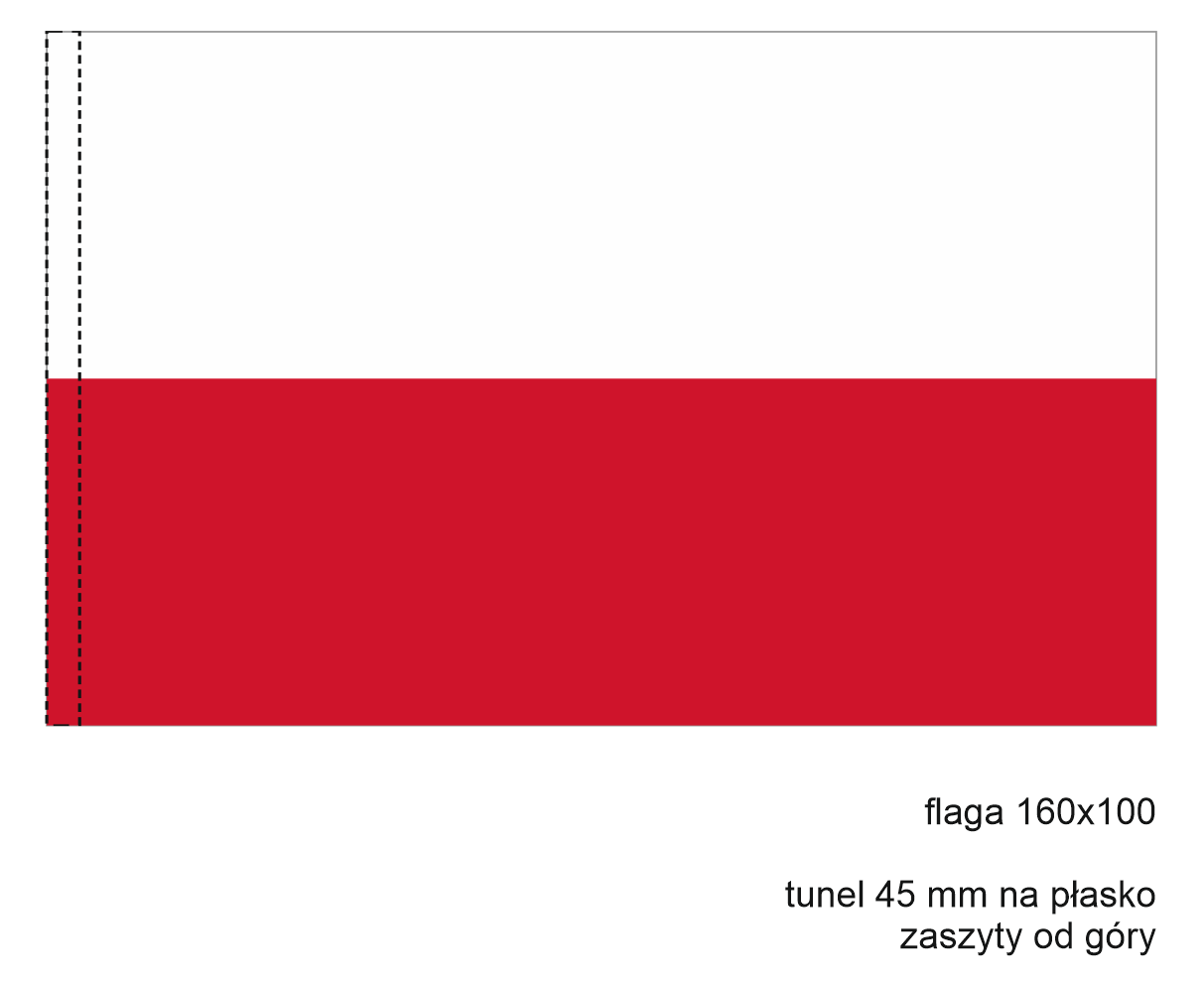 Flaga drukowana - czerwony pas nadrukowany na materiale, brak szwu między kolorami, podwójnie stębnowana, po bieli białą nitką, po czerwieni czerwoną.