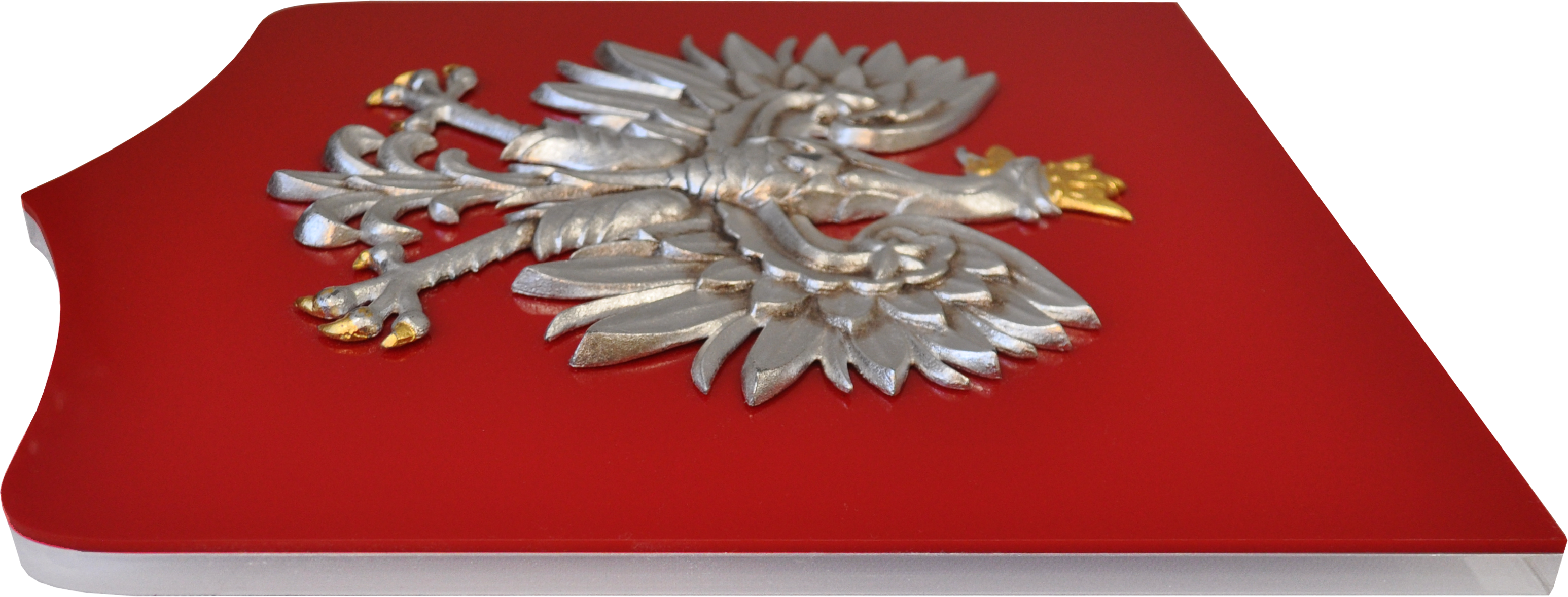 ORZEŁ SREBRNY 21x23 cm NA TARCZY PLEXI CZERWONEJ 30x35 cm