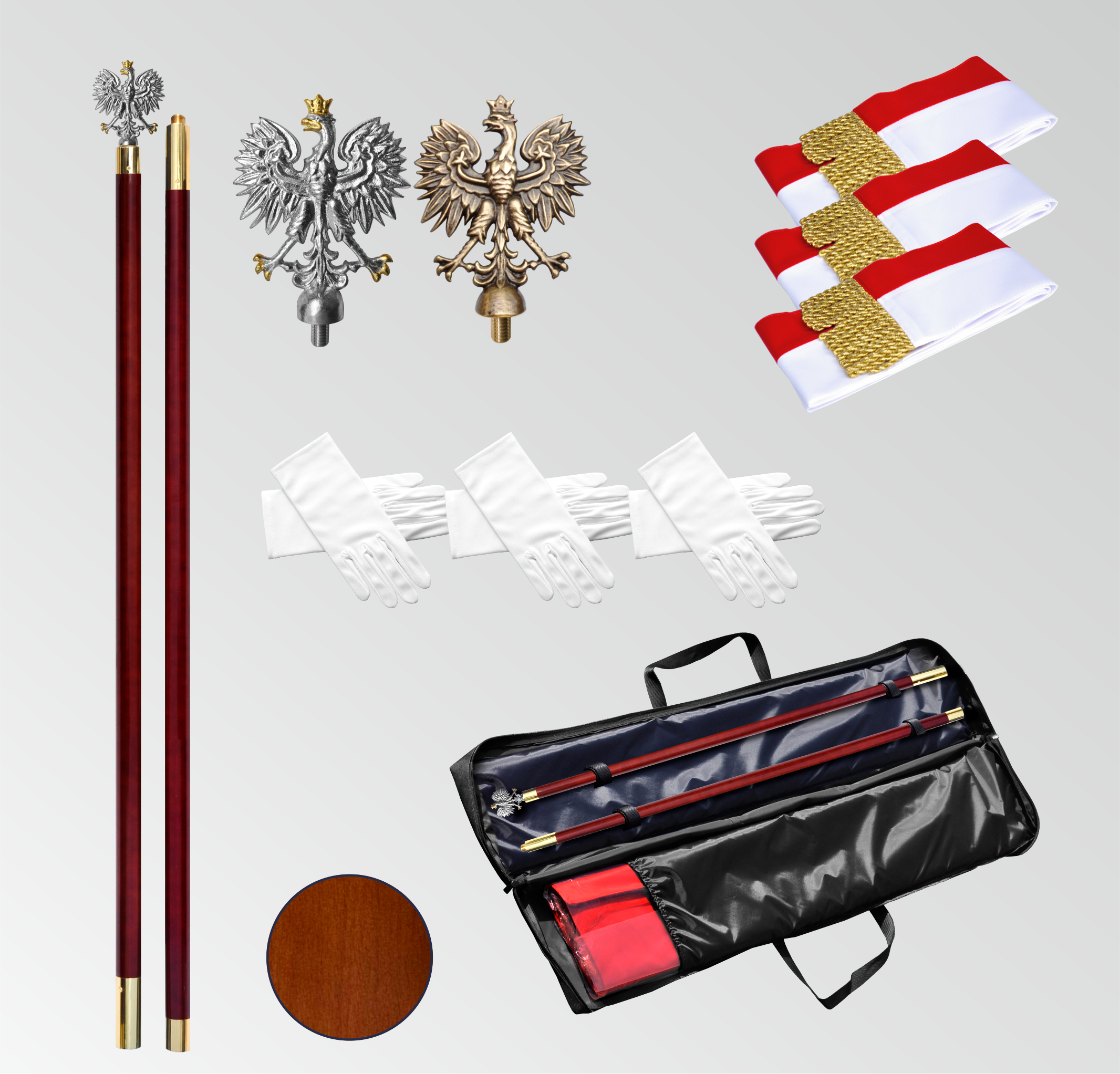 W zestawie flaga satynowa RP, 2 napinacze flagi, drzewiec GALOWY, pokrowiec z kordury, szarfy do pocztu sztandarowego, rękawiczki.