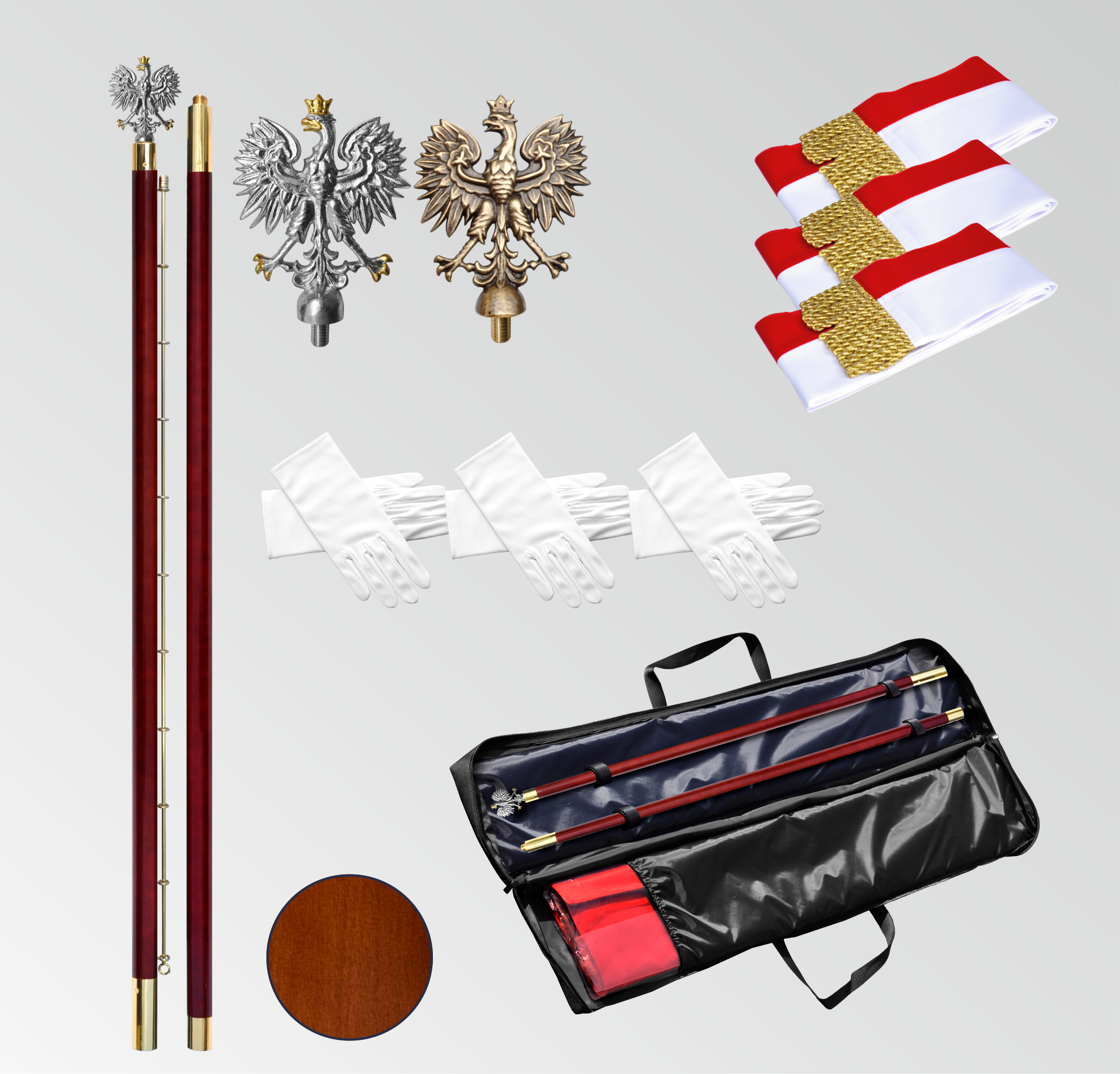 W zestawie flaga satynowa RP, drzewiec GALOWY ze szpilą, pokrowiec z kordury, szarfy do pocztu sztandarowego, rękawiczki.